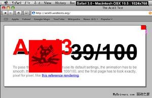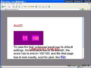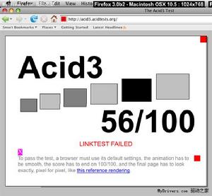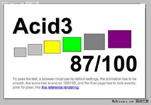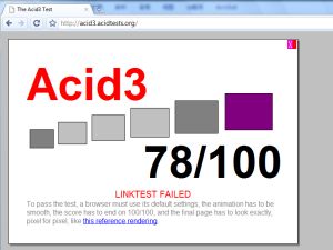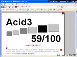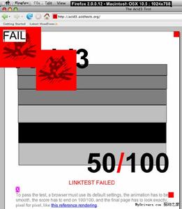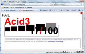 就像新版3DMark會秒殺一切現有硬體平台一樣,現在還沒有一款瀏覽器能在Acid3測試中過關,包括InternetExplorer、Opera、Firefox、Safari等等,最慘的IE6隻能得到11分,Firefox3Beta3則能拿到59分,接近及格,另外Webkit能達到87分,google 最新推出的瀏覽器chrome的4.1.249.1036beta版acid3測試滿分100,safari4.0.5版本acid3測試滿分100。
