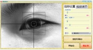 請單擊“開始”按鈕,等畫面出現眼部圖像後,調節“檢測區域”,讓綠色部分覆蓋住眼球(顯示模式請設定為:3),當螢幕出現十字後,調整“瞳孔、虹膜大小”,讓定位更加精確。