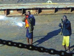 除了留守在艇上的兩名海盜,7名荷槍實彈的海盜很快全部登上了甲板。他們手中有衝鋒鎗、自動步槍和火箭筒,氣焰囂張,上來就不斷鳴槍。危急時刻,船員們搬出空的啤酒瓶,往裡灌上易燃的“油漆水”,再用棉紗浸上柴油做導火索,準備了200多隻“土燃燒瓶”。有的船員拉出了消防用的高壓水槍,船員們從隱蔽處抄起高壓水龍頭,高壓水龍如箭一樣射向窮凶極惡的海盜。