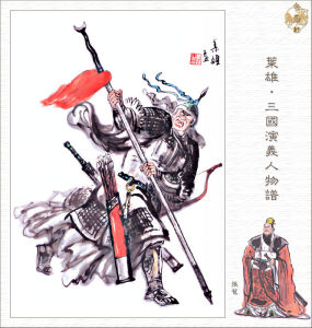 張苞二人拜辭先主,會合先鋒,一同進兵,列成陣勢。孫桓聽知蜀兵大至,合寨多起。兩陣對圓,桓領李異、謝旌立馬於門旗之下,見蜀營中,擁出二員大將,皆銀盔銀鎧,白馬白旗:上首張苞挺丈八點鋼矛,下首關興橫著大砍刀。苞大罵曰:“孫桓豎子!死在臨時,尚敢抗拒天兵乎!”桓亦罵曰:“汝父已作無頭之鬼;今汝又來討死,好生不智!”張苞大怒,挺槍直取孫桓。桓背後謝旌,驟馬來迎。兩將戰有三十餘合,旌敗走,苞乘勝趕來。李異見謝旌敗了,慌忙拍馬輪蘸金斧接戰。張苞與戰二十餘合,不分勝負。吳軍中裨將譚雄,見張苞英勇,李異不能勝,卻放一冷箭,正射中張苞所騎之馬。那馬負痛奔回本陣,未到門旗邊,撲地便倒,將張苞掀在地上。李異急向前輪起大斧,望張苞腦袋便砍。忽一道紅光閃處,李異頭早落地,原來關興見張苞馬回,正待接應,忽見張苞馬倒,李異趕來,興大喝一聲,劈李異於馬下,救了張苞。乘勢掩殺,孫桓大敗。各自鳴金收軍。
