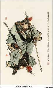 張清出場時,作為他陪襯的兩隻虎“花項虎”龔旺與“中箭虎”丁得孫,也是善使暗器的,前者用飛槍,後者用飛叉。龔旺的飛槍只有一柄,有點像古羅馬的武士,因此一發不中,便要落敗。丁得孫的飛叉是從腋窩下射出去的,可能是裝上機關的。只是他們的拿手好技跟張清比起來,實在是不可同日而語了。