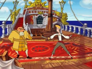 去血之島的路程很不順利,一開船地圖就被ROTTINGHAM搶走了(理髮店的仇,更主要的是財寶),這下叫我怎么救ELAINE?我的船員一個也不幫我,他們的歌雖好聽但幫我不了,當然我知道自己該怎么辦,那就當一次真正的海盜吧!我在海上同各種海盜進行戰鬥,搶劫他們的財寶,戰鬥的方式是看誰嘴上功夫更利害,正所謂君子動口也動手,勝利帶給我財富,回到港口,KENNY為上律師學校正在販賣軍火,我不停地升級,直致武裝上了超級大炮;失敗也可以學習他們的“劍訣”。終於我和ROTTINGHAM面對面決鬥了,這傢伙真的很難對付,一般海盜的劍訣根本不管用,我練了許久才制服了他(註:許多朋友可能過不去,這裡提供幾條劍決,作為對付ROTTINGHAM用,當他說