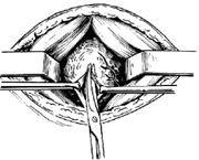 1、體位,切口 體位同甲狀腺次全切除術。在胸骨切跡上2橫指沿皮紋橫行切開。切口宜靠近腺瘤,長度視腺瘤大小而定。2、顯露腺瘤 皮瓣分離和甲狀腺前肌群的切斷、分離均同甲狀腺次全切除術。顯露甲狀腺後進行全面仔細檢查,明確病變的部位,數目及性質。如腺瘤較小,向左右兩側充分拉開甲狀腺前肌群即可,不一定常規切斷肌群。3、切除腺瘤 如為囊腫多系良性,可先縫扎或鉗夾腺瘤表面甲狀腺組織的血管,然後切開表面的甲狀腺組織,直達腺瘤表面,用彎血管鉗或手指沿腺瘤周圍作鈍性分離直至蒂部,將腺瘤從周圍的甲狀腺組織中剝出,將蒂部鉗夾、切斷後結紮,切除腺瘤。在剝離過程遇有出血點時均應鉗夾止血,待腺瘤切除後,血管鉗所夾的血管組織須一一結紮。最後,用細絲線間斷縫合甲狀腺組織和甲狀腺包膜,以消滅腺瘤切除後所留下的殘腔。如為實質性腺瘤,在切除過程中應將腫瘤周圍的1cm正常腺體組織一併切除。4、引流、縫合 仔細止血後,於腺瘤窩置一膠皮片,自切口側角引出,然後逐層縫合切口。