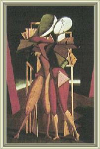 1917年,契里柯的畫題從戶外轉入戶內,由寬闊的廣場變為狹窄的房間。他開始放棄"形而上"繪畫,轉向對文藝復興晚期繪畫的模仿。事實上,形而上畫派1919年已分解了它的凝聚力。契里柯只畫些靜物。畫上出現了許多有規定性的線形交織,直線規矩用得更密。畫家在弗拉拉散步時,看到商店櫥窗再聯繫他在醫院內的生活,他的作畫素材變成一些三角板、棍棒、甲冑之類物體的雜湊,形成他所謂"靜物戲劇化"的效果。這幅《赫克托耳與安德洛瑪刻》(作於1917年,有90×60厘米大,現歸米蘭一私人Gianni Matfioli收藏)就是這樣一個例子。它很象立體主義作品。畫上是兩個舞台人物,除了有他以前慣用的時裝模特兒架子外,還多了三角板、木棍、直角劃線尺等等東西。他把這些東西構成機械裝置,以象徵希臘神話中一對傳為美談的恩愛情侶。