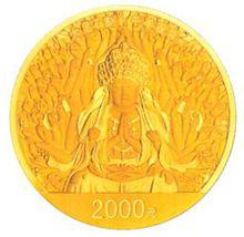 150克圓形金質紀念幣背面圖案為“千手觀音”造像,並刊“大足石刻·千手觀音”字樣及面額。
