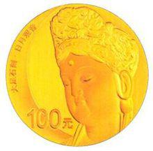 150克圓形精製金質紀念幣正面圖案8克圓形金質紀念幣背面圖案為“日月觀音”頭部造像,並刊“大足石刻·日月觀音”字樣及面額。