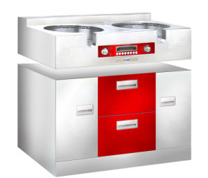 一種是深井式,深井式顧名思義,他的鍋架是凹進去的,鍋是放在裡面的,油煙在鍋的邊沿被吸進去,通過渦輪起到油煙分離的作用