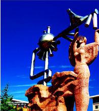 核心元素“創造太陽”:雕塑的圓球象徵太陽,周圍的短管道比喻太陽輻射出的萬丈光芒,長管道是油氣集輸管線。人物象徵著開發能源、從事高等教育的園丁,她高高舉著的是一本厚厚的書,象徵著書山有路勤為徑,指引萬千石大學子在科學的殿堂上勇於攀登。從正面看這個人,她的衣服有個飄帶,有兩層寓意:一是象徵著海上的波浪,二是象徵著一層一層的地層,指現今我們的採油是從海上和陸地兩個方面進行。雕塑的底座是非常逼真的海上鑽井平台的樣子。整個雕塑還意味著運用知識能源開發物質能源,創造出一個新的太陽。雕塑的設計思路主要源於老校長楊光華先生倡議,其核心內容是集中展示中國石油大學的辦學特色和價值理念,即以石油開採和利用為主要研究對象,以石油石化人才培養為己任,以科技知識為國家奉獻能源為使命的深刻內涵。雕塑的設計者為前廣州雕塑院的院長、著名雕塑家唐大禧先生。