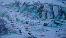 鳳凰山全景圖全山分西山、東山、廟溝、古城四大景區。其中,西山景區景點最集中,也最奇險。 由紫陽觀出發游西山景區,眼前展現3條登山路,即中路、東路和西路。中路經斗母宮、碧霞宮、觀音洞、鳳凰洞、蠶娘柞、鳳淚、靈仙洞、臘柞連理等主要景點至羅漢峰。由羅漢峰西行,即可去箭眼。東路經朝真橋、三教、一品洞天、誦經台、觀音閣、聚仙台、雙龍背、仙人座等主要景點至烽火台。由烽火台西行,即可去箭眼。西路經斗母宮、忽必烈塔、裂石松、點將台、甬洞、鳳舞松等主要景點至將軍峰。由將軍峰西行,即可去箭眼。一般說,以取中路為最佳、東路次之,西路又次之。