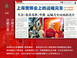 “先武穆而神,大宋千古,大漢千古;後文宣而聖,山東一人,山西一人”武聖關公與文聖孔子雕像分別代表山西山東兩省同時參展上海世博會,是中國國家館人文館的一大亮點。山西館陳列的關公青銅雕像《夜讀春秋》,引用於右任語“春秋一書,代表著民族精神;忠義二字,團結了中華兒女”做為題照,意在突出關公忠義、誠信精神和維繫海內外同宗同信仰的炎黃子孫。
