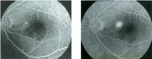 病程6個月以內,具有典型中漿表現,眼底黃斑區視網膜半透明泡狀隆起,中心凹光反射消失,漿液脫離區內或毗鄰可伴有水泡樣RPE脫離。FFA表現為一個或多個RPE水平的螢光素滲漏,隨造影過程表現為墨漬或冒煙狀滲漏擴大。慢性中漿