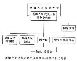 1982年憲法規定的國家機構 1966年後,國家由於遭到“十年動亂”,人民代表大會制的國家機構遭到嚴重破壞。全國和地方各級人民代表大會不能按期開會,其他機關亦多不能履行職權,地方各級人民政府被革命委員會所取代,人民法院獨立行使審判權被取消,檢察權交由公安機關行使,撤銷了檢察機關,這就使中國國家機構的正常活動受到嚴重影響。1976年10月,中國共產黨在人民民眾的支持下,粉碎了江青反革命集團,結束了動亂時期。1978年12月,中國共產黨召開十一屆三中全會,實現黨和國家工作的重點轉移,並著重提出了健全社會主義民主和加強社會主義法制的任務。經過立法程式,規定各級人民代表大會及其常務委員會必須按期開會,使省、縣兩級人民代表大會增設了常設機構,縣級和縣級以下人民代表由選民直接選舉產生。1981年6月,中國共產黨十一屆六中全會通過《關於建國以來黨的若干歷史問題的決議》,全面總結了建國以來的經驗教訓,提出必須鞏固人民民主專政,完善國家的憲法和法律,“必須根據民主集中制的原則加強各級國家機關的建設,使各級人民代表大會及其常設機關成為有權威的人民權力機關”。1982年上半年,國務院對其體制和組織機構進行了重大改革。這一切,為制定1982年憲法準備了條件。