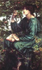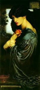 作品:《白日夢》普羅賽比妮,亦譯珀耳賽福涅,她是古代希臘神話中農神德墨特耳的女兒。冥王哈德斯愛上了她,把她劫到冥界。農神失去了愛女,悲痛萬分,從此不再賜予人間穀物收成,人類險於絕滅。主神宙斯下令冥王將普羅賽比妮還給其母,冥王為繼續與她往來,強迫她吞下幾粒石榴子。石榴子是姻緣不斷的象徵,這樣普羅賽比妮只好每年在人間同母親住一時期,又回到冥界當一段時間冥後。羅賽蒂的這幅作品是借神話故事中的普羅賽比妮來表現自己心目中的情人形象。肖像背景的黑色代表著冥界。手中的石榴和凝神遐思是代表思念人間生活。從畫面色調上看,剝開的紅石榴也成點睛之筆,形成畫面視覺中心,極其醒目。