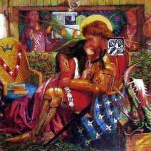 藝術家的情感決定藝術作品精神氣質和審美傾向,感情被壓抑或被扭曲,作品中所傳達出來的藝術形象可能就是一種病態。羅賽蒂有理想,可是在嚴酷的現實面前不斷破碎。他鍾情過幾個知心女子,但因倫理所迫,給他留下了無盡惆悵。他最終只能遁跡於藝術世界,到幻想中去尋求他的理想寄託。他所有的詩文和畫作都如同垂死天鵝的哀鳴,淒切哀婉,令人傷神。他總算在這幅《聖喬治和薩卜拉公主》中找到一點安慰。畫面以裝飾和想像的形象構成,具有一種非現實的境界。