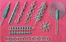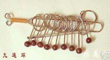 各式各樣的九連環 九 連環流行極廣,形式多樣,規格不一。其製作,用金屬絲製成圓形小環九枚,九環相連,套在條形橫板或各式框架上,其框柄有劍形、如意形、蝴蝶形、梅花形等,各環均以銅桿與之相接。玩時,依法使九環全部聯貫子銅圈上,或經過穿套全部解下。其解法多樣,可分可合,變化多端。得法者需經過81次上下才能將相連的九個環套入一柱,再用341 次才能將九個環全部解下。此外,也可套成花籃、繡球、宮燈等狀。