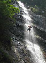 第二潭,也在三面峭壁之間,但左壁上有一橫裂縫,縫中長著龍鬚草,可踏草到達潭邊。潭為卵形,長徑約二十米,寬徑約十米。大潭中更套一小圓潭,直徑約七米,恰似卵黃。水由淺入深淺處約八米,最深處為小圓潭,不見底。潭水隨時變化;一會兒象塊塊綠玉;一會兒又變成片片龍鱗;一會兒象群龜戲水;一會兒又變成千條金蛇游戈;真是五彩繽紛,變化萬千。此潭又名龍母潭。站在潭邊懸崖之上,看高二十餘米的上瀑注入潭中,已覺壯美;而現原下直落百餘米的瀑水下瀉,則更感神奇了。第三潭,位於兩大懸瀑之間,下瀑高約五十米,上瀑高達百餘米,三面峭壁,難以登攀,只能將繩索繫於高處崖岸的樹幹上,順索下墜才能到達潭邊,潭圓形,直徑約十五米,深不可測。臨潭觀賞,飛瀑高接雲天,下落深淵,綠濤如沸,蒸騰翻滾,雷震山谷,雄偉多姿。 乃陝西瀑布之奇觀。