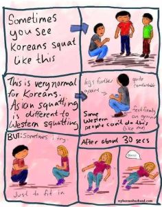 UrbanDictionary是這么解釋“泡菜蹲”的:這是一個軍事俚語,指90%的亞洲人的坐姿。“泡菜蹲”的正確姿勢是:臀部碰到後腳跟,整個腳掌著地。大多數亞洲人能夠在等公車、抽菸、解手的時候長時間保持蹲姿,但只有不到5%的美國人能夠保持這種姿勢。