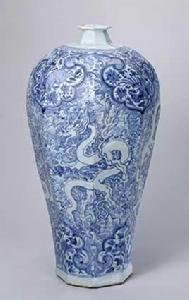 元青花海水白龍紋八方梅瓶梅瓶胎骨厚重,小口平沿,頸細短。瓶身修長,有八棱。瓶身中部六條白龍凸起,襯以青花海水、火焰紋,瓶肩和下腹部各繪青花雲頭紋,內畫鳳穿牡丹紋。