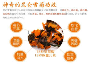 5.崑崙雪菊營養物質含量多且高。崑崙雪菊的胺基酸中含有其他菊花罕有的胱氨酸,同時苯丙氨酸,賴氨酸,甘氨酸含量高於其他的大多數品種。並且崑崙雪菊的總黃酮含量高出其它菊花許多,甚至幾倍。崑崙雪菊的蛋白質,糖類含量也遠遠高於其他菊花。
