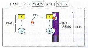 ITIM即免疫受體酪氨酸抑制基序,主要存在於某些抑制性受體分子胞內部分,與ITAM不同,ITIM中的酪氨酸發生磷酸化後,可被PTP分子上的SH2結構域所結合,從而招募PTP並使之活化,起到抑制PTK參與的激活信號轉導通路作用。