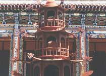 圓通塔是一座磚、石、土混築的喇嘛教塔。佛塔通高23.37米,甚為巍峨壯觀。全塔由塔座、塔身、塔脖、相輪、華蓋和塔剎組成。塔座呈正方形,邊長8.7米。塔座之上和和須彌座四角之上都各設小塔一座。須彌座上面為覆缽體塔身,其上為塔脖,呈圓狀,周圍開20龕,每龕內或置銅佛或置菩薩像,神態安詳,似在為每一個遊人祈祝平安。塔身之上有相輪13重,又稱十三天,顯示了該塔至高無上的級別。相輪之上有圓形華蓋,圍繞著鐵流蘇並等距離懸垂鐵制風鈴36個,虞風吹來,音韻清遠,似在為每個遊人引導方向,摧人奮進。華蓋之上為瓷製黑寶頂,日月照耀之下,光閃渭渭,很遠即可看到。
