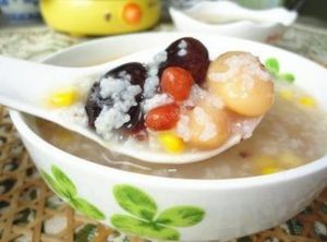 材料:稠粥1碗,胡蘿蔔丁25克,青豆25克,嫩玉米粒50克,香菇丁25克