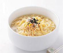 3、此時半成品切面還不宜烹製食用,還需有個“吸水”過程。即將冷水沖晾後的面分成10份盤在碗中(目的是保持半成品外形美觀,展示時能吸引顧客)再倒扣在細眼面篩中,面上加蓋濕布(以免風吹使局部麵條脫水變硬)靜置3小時以上。 切麵食用時的烹製以熱拌最為簡便,因而也是居家最樂意採用的方法。熱拌的做法是將多量的水旺火燒開後下入麵條,煮開透心裝盆,調入醬油、精鹽、味素、蒜頭醋(蒜泥加香醋混合浸漬)、蔥頭油(豬油加蔥白炸香)、蔥花等拌均勻即成。