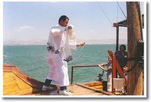 漁民在加利利海捕魚加利利海在巴勒斯坦境內。起源於北端黑門山的約旦河,以清澈的溪流,源源不斷地注入了加利利海敞開的胸懷。在這裡,你能欣喜地看到:高天流雲下,湛藍的海面雪浪輕卷,百舸爭流;水中游魚如織,水草也在水底招搖;海岸線上,萬木蔥蘢,鳥聲啁啾,人們則在海邊安居樂業。萬物皆因這淡海水的滋潤顯出勃勃生機。