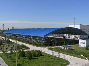 8、污染土壤修復系統該系統是採用美國的空氣支撐膜結構系統建成的修復車間,占地面積8100平方米,高度20米,選用具有國際先進水平的BLYF-530-XF型翻拋機,在車間內建有10道2米高混凝土牆作為翻拋機基礎,總計9條存放污染土的儲槽,修復過程中,翻拋機在混凝土基礎上前進,翻動下方的污染土使污染物釋放出來。車間還設有高標準的環境空氣品質線上監測系統、自動控制系統、變頻式換風系統和尾氣處理系統,以確保修復作業全過程中,車間內空氣品質符合安全和職業健康相關標準、尾氣排放符合相關排放標準。