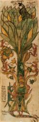 還有四匹大鹿賓士於樹枝之間,無饜地嚼吃新發的嫩芽,四匹大鹿象徵四個方向的風,吹拂著樹枝。