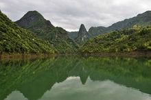 石柱峽景觀 其中石柱峽最為突出,高大的石柱矗立在清澈而又平靜的深水中,與湖兩岸綠意盎然的樹林交相輝映,帶來震撼而又人跡罕至的奇觀之感;風水極佳的小呈山、形狀與地名互相呼應的將軍岩、筆架峰更是在融入當地的傳奇的人文故事後,險峻的外觀更添神秘。