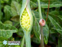 花序柄長25~30(~35)厘米,長於葉柄。佛焰苞綠色或綠白色,管部狹圓柱形,長1.5~2厘米;檐部長圓形,綠色,有時邊緣青紫色,長4~5厘米,寬1.5厘米,鈍或銳尖。肉穗花序:雌花序長2厘米,雄花序長5~7毫米,其中間隔3毫米;附屬器綠色變青紫色,長6~10厘米,直立,有時“S”形彎曲。