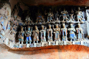 半月山大佛半月山大佛屬摩崖造像,即在山崖石壁上雕造的佛像。其為彌勒佛倚坐像,屬淨土宗造像。大佛端坐於長方形石龕中,坐南朝北,身高22.24米,胸寬11.2米,結構雄渾古朴,氣魄宏大,一望而令人產生敬畏之心。而佛像面部豐潤,雙耳垂肩,表情安詳恬靜,目光平和下視,好象在關切地注視著禮拜者,又使人覺得可親可敬。
