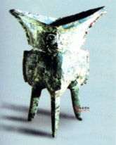 傳河南陽出土。 凹弧形口,腹分襠,獸首鋬,尖錐狀足,口下飾三角紋,腹飾獸面紋。