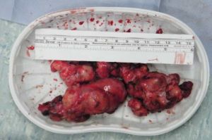 ③少數病例中,病變沿靜脈擴展或附於靜脈壁,伸入髂靜脈、腎靜脈、下腔靜脈、右心房;位於血管和心腔內的腫物呈長條狀,可長達數十厘米,粗細不等,表面光滑;腫瘤常游離於血管腔內,隨血流方向而擺動,也可有小蒂附於血管壁上;作者報導的病例中腫瘤長達44cm(圖1),有作者報導腫瘤超過55cm;腫瘤嚴重阻塞三尖瓣口或肺動脈,則可造成病人死亡;