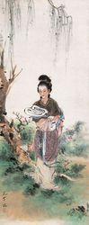 2.開臉:吳光宇的線描筆法不拘物形,靈活多變,飄逸瀟灑,老到貫氣。其筆墨非常講究,衣紋、皴擦時筆筆貫氣,柔而不媚。其人物造型結構準確,體態修長,步態沉穩,形態瀟灑,色彩和諧,衣著華美,服飾玉潤。她筆下的人物體態有一個重要特徵,就是人物的上體稍微向前傾,但是人體的整體重心還是保持正常的。