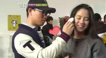 131117 E172 國民棒球手接上一場的攻守遊戲,最後智孝贏了,製作組多給一個棒球。她問可不可以給別人,然後就給了姜Gary。到達MT之後眾人下車往場地走,Gary一把從後面拉住智孝,倆人單獨在後面走,在石回頭看見了就跟大家說"這倆又在幹嘛"秀智也說"真好,一邊錄節目一邊談戀愛",倆人也沒解釋,就落後大部隊在那一起走著。玩潛水眼色遊戲,Gary輸了,製作組說必須像哈哈那樣有柳賢振給的機會才能再來一次,Gary說這樣的話他要宋智孝機會。躲避球遊戲製作組說要分couple組,大家都在嚷嚷,倆人在後邊打情罵俏。一開始,Gary就緊握智孝抓在自己腰以上腋下的手,倆人還緊貼著,中間情況緊急,就變成了智孝被圈在Gary的胳膊下面,倆人緊摟著,大家看到了都在調侃(此環節為重點)。料理對決買菜組買菜回來,倆人就緊挨著坐吃魚糕。