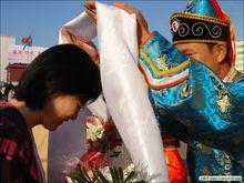 獻哈達儀式一 獻哈達是一種文明與禮貌的表現,因此十分講究。獻哈達者應將哈達對疊再對摺成四幅雙楞,把雙楞一邊整齊地對著被獻者,躬身俯首,雙手奉獻,表示恭敬。被獻者也必須彎腰俯首,雙手承接,表示回敬 。切忌用一隻手相送或一隻手受禮。獻哈達的方式也有許多區別:下級向上級,晚輩向長輩,或向活佛獻哈達,應躬身低頭,雙手舉哈達呈上或放在座位前的桌子上面或腳下,對方並不回贈哈達。這時的哈達,表示敬意和感謝;同輩平級獻哈達,表示友好,應該獻在對方手上,對方回贈哈達;上級對下級,長輩給晚輩贈哈達,表示親切關懷和慈祥的愛意,可直接將哈達掛在對方頸上;如果是喜慶典禮,主人往往將所獻哈達回贈給獻者,並繞在他的脖子上;他人為自己獻哈達時,應將身體微微前傾,恭敬地雙手接過,然後繞過頭頂掛在自己頸上,以示謝意。