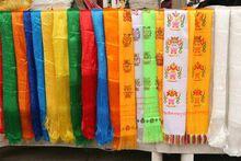 哈達布料 哈達是一種特製的絲織物或麻織物,長度通常為5尺左右,寬度不等,上繡有“雲林”“八寶”等民間花紋圖案。哈達是一種生絲織品,以綾、綢、絲原料製成,現在人們生活中的哈達也有不少是呢絨材料的,不過都紡得稀薄透明,有白、黃、藍等色。其上織以八瑞相及蓮花、如意、祥雲等圖案。哈達長短不一,短者三五尺,長者一二丈。方誌《蒙古·二卷》中雲所謂哈達者,帛也。或以綢、或以白、或藍、長短不一,長約一尺五寸或一尺二寸,兩端有拔絲,約半寸許,其長短視受者分級而定。按質料來分,哈達分為三種:普通品為棉紡織品,稱為“素喜”,不到1公尺長;中檔品為一般絲織品,稱為“阿喜”,約有2公尺長;對政治、宗教界高級人物使用的高級絲織品,是檔次最高的一種,稱為“浪翠”,有3公尺多長。