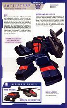 圈套並且可以分別單獨執行任務。他只有在組合成機器人的時候才擁有完整的“人格”。四驅車擁有90英里/小時的最高速度和600英里的作戰半徑。而其直升機則可以在1,200英里的作戰半徑內以780英里/小時的速度巡航。在機器人形態下,圈套使用具有夜視功能的雙管飛彈發射器。