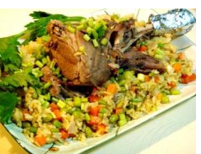 19.把煮熟的羊腿從熱湯中取出,在脫骨的部位用錫紙包好,放在米飯上,撒上香芹碎。