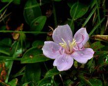 聚傘花序,頂生,有花(1-)3朵,基部有葉狀總苞2,通常較葉小;花梗長2-10毫米,被糙伏毛,上部具苞片2;苞片卵形,長2-3毫米,寬約1.5毫米,具緣毛,背面被糙伏毛;花萼管長約5毫米,被糙伏毛,毛基部膨大呈圓錐狀,有時2-3簇生,裂片披針形,長2-3毫米,被疏糙伏毛,邊緣具刺毛狀緣毛,裂片間具1小裂片,較裂片小且短;花瓣淡紫紅色至紫紅色,菱狀倒卵形,上部略偏斜,長1.2-2厘米,寬1-1.5厘米,頂端有1束刺毛,被疏緣毛;雄蕊長者藥隔基部延伸,彎曲,末端具2小瘤,花絲較伸延的藥隔略短,短者藥隔不伸延,藥隔基部具2小瘤;子房下位,頂端具刺毛。