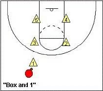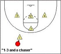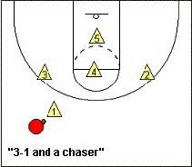 這種防守適用於有明星控衛,但是沒有強力低位選手的對手。這種防守本質上很像1-3-1區域聯防。唯一不同的是,最外面的“1”號球員是進行盯人防守的。而其餘的四人則是3-1區域聯防。這種防守可以讓你對對手的明星控衛進行一對一盯防並同時對翼側射手和高位的球員保持壓力。而低位上的防守就會相對薄弱。這種防守的站位和“1人盯人,4人1-3聯防”相反。兩種防守都可以用來應付對方的明星控衛。當對手的外線不準、內線有實力的情況下就應該選擇“1人盯人,4人1-3聯防”。而當對方外線很準但是內線不強的時候,就使用“3-1”站位,當然你也可以把這兩中防守交替著使用。例如當你使用“1-3”站位之後對方又開始投中外線的投籃,那就應該轉為“3-1”站位。