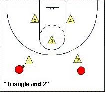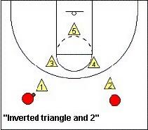 如果你選擇剛才所述的“2人盯人,3人三角站位”的防守,而進攻方又採取兩後衛在後場落位的策略來牽制中間罰球線的防守隊員,遇到這種情況,你可以選擇讓你其中一個處在低位的防守人提到發球線上。這時候你的防守就是由一人在禁區中路、二人分處牛角位而構成的“倒三角”陣型。