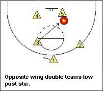 A3、有一種策略是:低位防守人側身封住底線的方向,不讓那個明星低位選手從底線轉身,迫使他向正面移動,以便己方翼側的球員過來包夾。這種策略是在假設對方外線沒有優秀的投手的情況下才使用的。要告訴翼側防守人,當球傳到他另一側的低位,並且那個低位明星球員正在向正面移動時就堅決的過去包夾他(圖A)。如果那個低位球員發現了包夾並且準備把球分給另一側的外線隊員,如果那個接球的隊員又有能穩定的把球投進的能力的話,那么我們就不得不改變我們的防守策略了。但是能同時做到以上這么多點的球隊並不多。