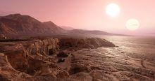 塔圖因現實生活中竟然也真有塔圖因星球,據報導,NASA利用克卜勒空間望遠鏡在天鵝座發現了一顆圍繞雙星運轉的行星,該行星是利用凌日法發現的,不過,該行星是一個類似於土星的氣體行星,而不是一顆類地行星。雖然它離兩顆恆星質心距離與金星軌道相仿,但因為兩顆恆星太不給力了:較大的一顆質量僅太陽質量69%,為一顆K型橙矮星,較小的一顆質量只有太陽質量的五分之一,是一顆紅矮星,因而它的雲頂溫度很低,大約在-70~-100℃左右,這個溫度只能允許液氨存在。故可能難以維持生命。具體情況可以去維基搜尋克卜勒16b