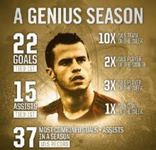 喬文科獲得射手王和助攻王2015年8月26日,在多倫多FC坐陣主場5-0大勝奧蘭多城的比賽中。喬文科打入一粒精彩的自由球,將自己加盟大聯盟首個賽季的進球數提升至17個,同時奉獻12個助攻,被一些媒體和評論員認為是大聯盟最有價值的球員 。