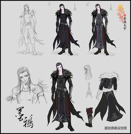 墨鴉,人如其名,整體裝束以墨色為主打,營造出肅殺與危險的氣場。貼身的服飾設計,吻合了其輕功高手的身份設定。黑色的羽毛,高超的輕功是他的標誌。以烏鴉為象徵元素,暗示著他是一個具有黑暗特質的神秘角色,周身洋溢著令人無法忽視的危險氣息……全身上下緊身的設計加上蓬鬆的黑色羽毛披肩則體現出其雍容、魅惑的氣質。而眼底獨特的紋路與衣服上的線條花紋相呼應的細膩處理,配以粗獷的腰帶及手腕、腰間與靴上的金屬飾物,將墨鴉的霸氣邪魅、硬朗利落彰顯無餘。
