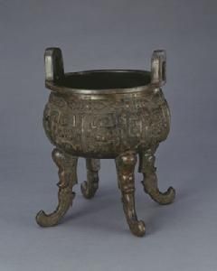 大明崇禎玖年潞國制銅鼎底款作為仿古彝器,此鼎融三代禮器的造型、紋飾於一體,把方鼎的四足移到圓鼎上,同時採用扁平外撇的獸體替代圓而直立的柱足或蹄足,從而打破了傳統的圓鼎三足而立的形式,完成了造型上對方鼎和圓鼎的雙重模仿。紋飾的仿鑄採用商周時期普遍流行的蟬紋和獸面紋,布局上也不改三代以獸面紋為主體、以蟬紋帶為附屬的古風。