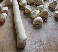 大白菜水餃7、面餳好後揉成一個均勻的長條,切成均勻的小劑子。將小麵團按扁擀成餃子皮,包餡即可。